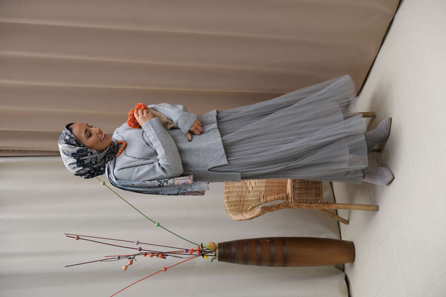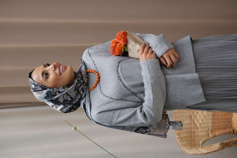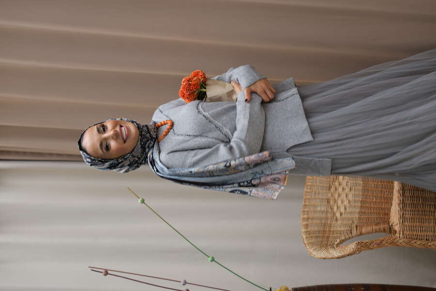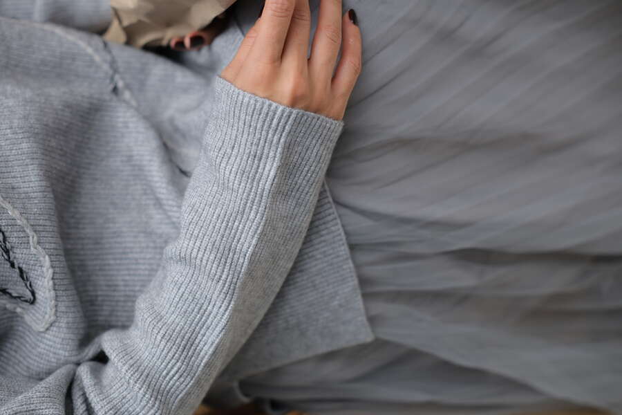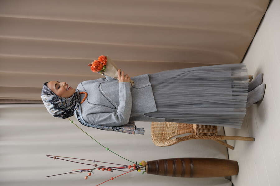 Kadın Asimetrik Dikişli Tüllü Triko Takım-Gri