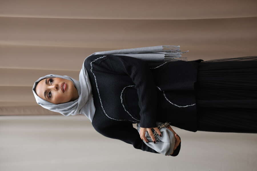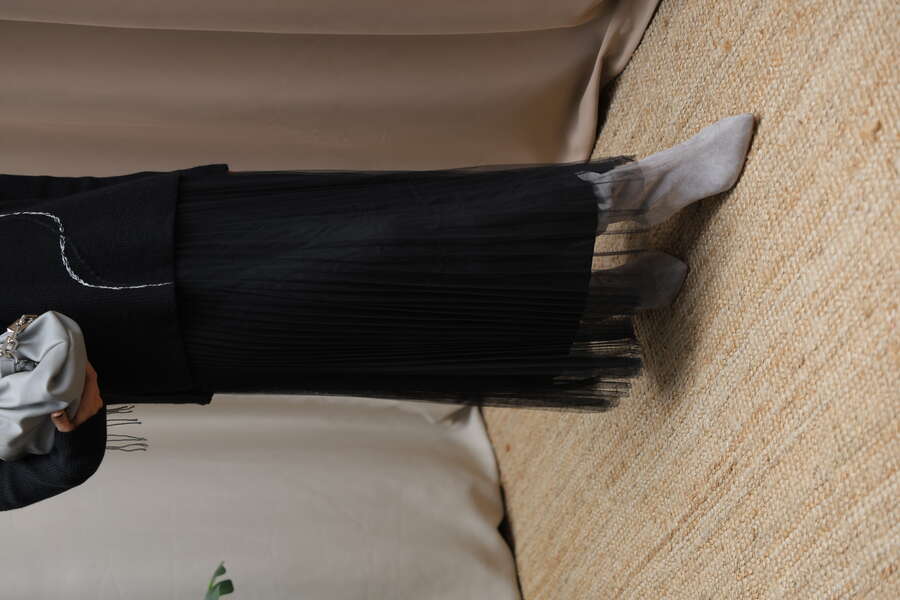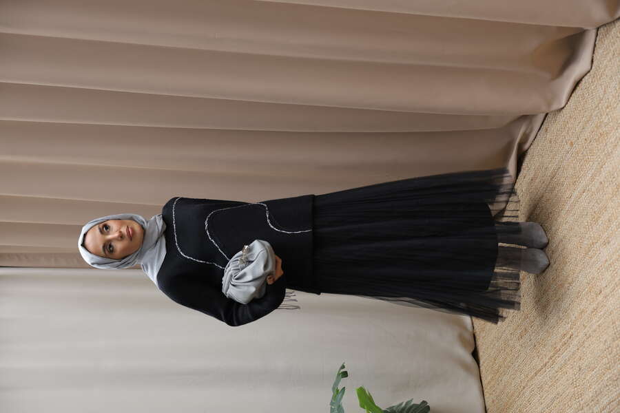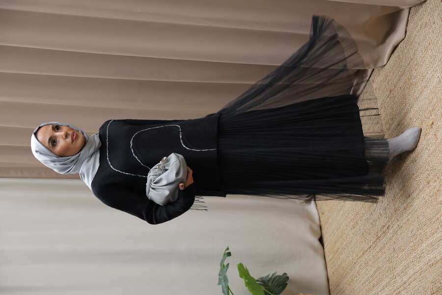 Kadın Asimetrik Dikişli Tüllü Triko Takım-Siyah