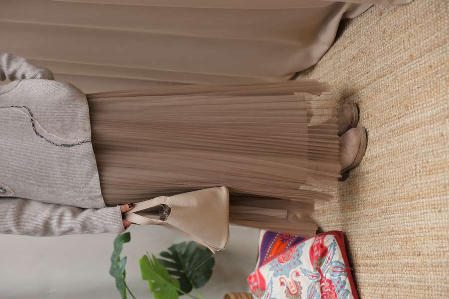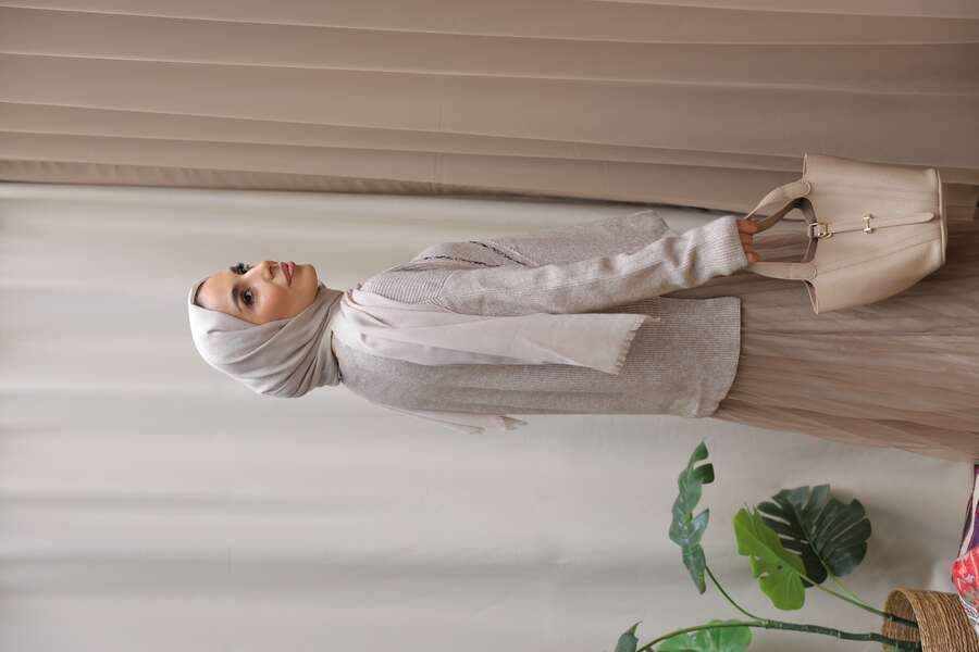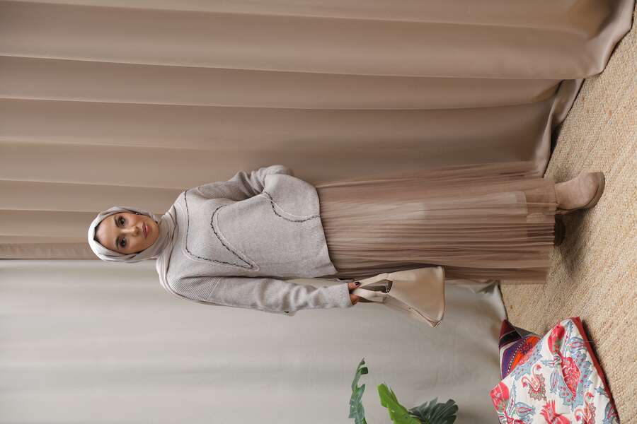 Kadın Asimetrik Dikişli Tüllü Triko Takım-Taupe